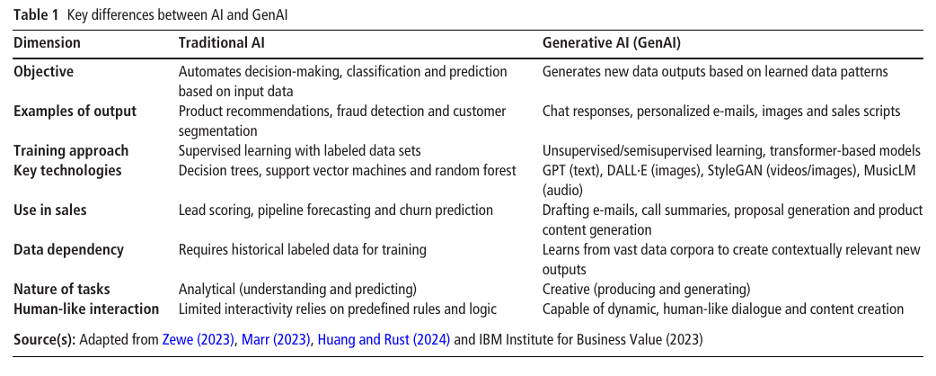 Table 1 (below) highlights clear differences and shows why GenAI represents a new capability for sales organizations. For industries focused on relationships and technical selling, like agribusiness, this presents both a chance and a challenge.